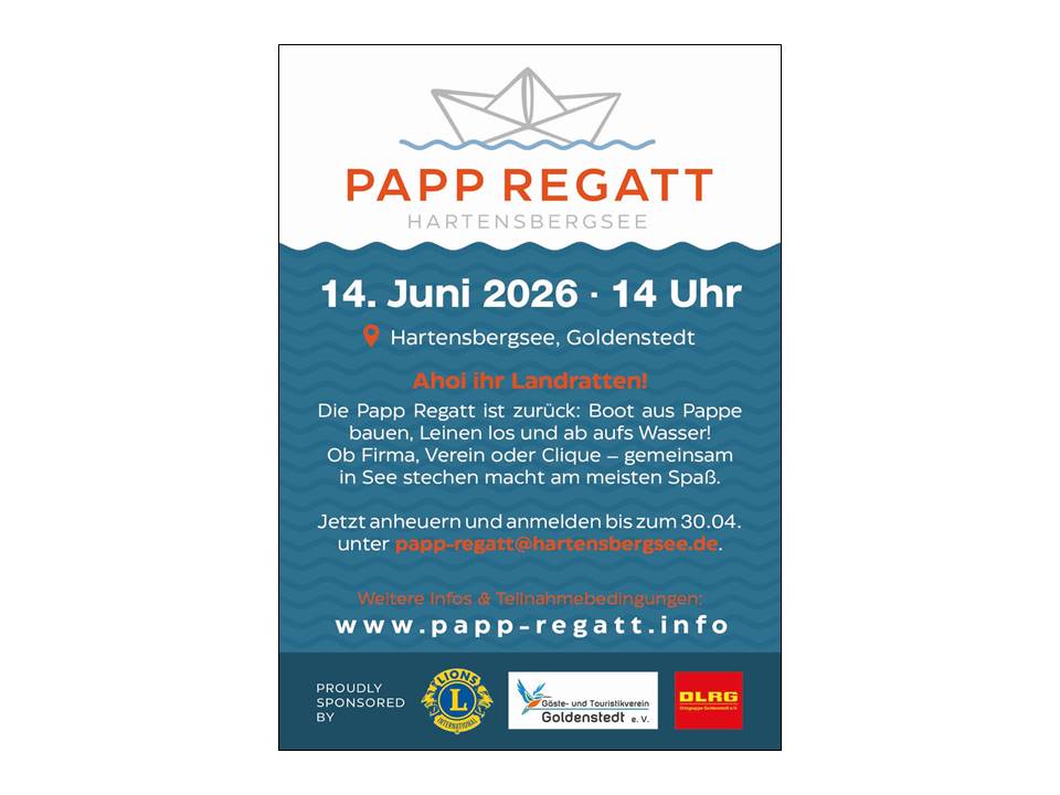 Für die Papp Regatt am 14. Juni auf dem Goldenstedter Hartensbergsee werden noch Teams gesucht. Für die schnellsten Boote gibt's insgesamt 1000 Euro Preisgeld. Infos und Anmeldungen unter www.papp-regatt.info